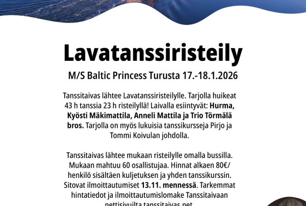 Tervetuloa Tanssitaivaan pikkujoulutansseihin Ulvilan Nuorisoseurantalolle (Välmäntie 6, Ulvila). Ohjelmassa tanssia, glögiä, ruokaa, kahvia ja ohjelmaa. Illan artistina Törmälä Bros. Lipun hinta 30€/jäsen. Liput myynnissä Tanssitaivaan salilla ja Taatan tuvalla 20.11. asti.