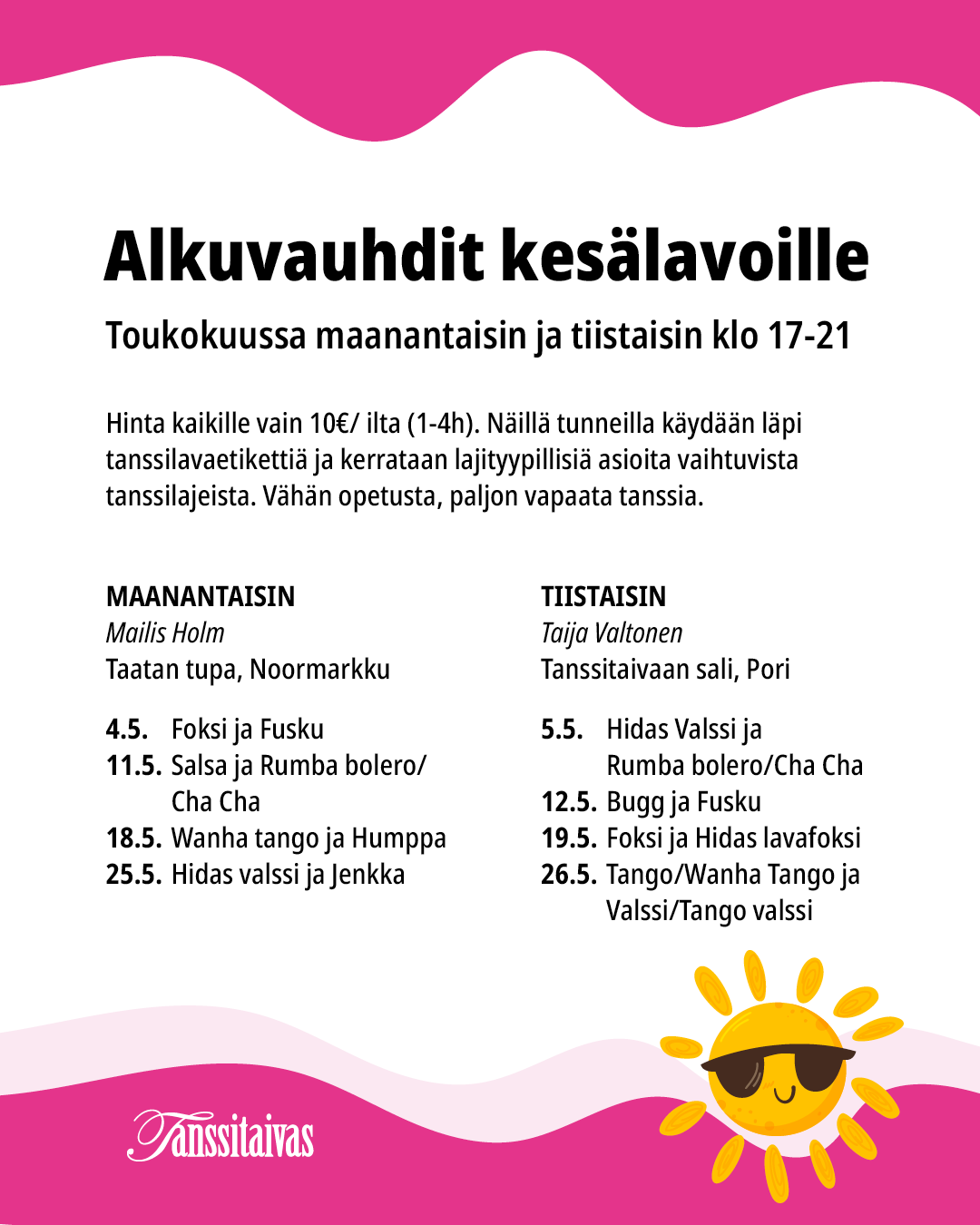 Hinta kaikille 10€/ilta (1-4h). Näillä tunneilla käydään läpi tanssilavaetikettiä ja kerrataan lajityypillisiä asioita vaihtuvista tanssilajeista. Vähän opetusta, paljon vapaata tanssia.
