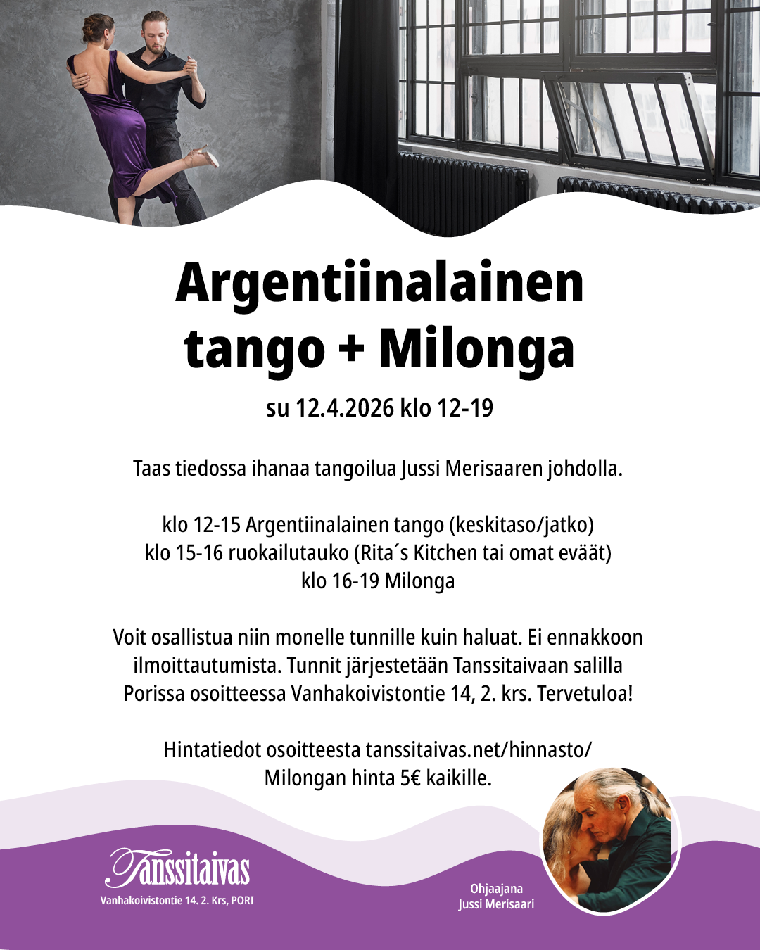 Hintatiedot osoitteesta tanssitaivas.net/hinnasto/ Milongan hinta 5€ kaikille.