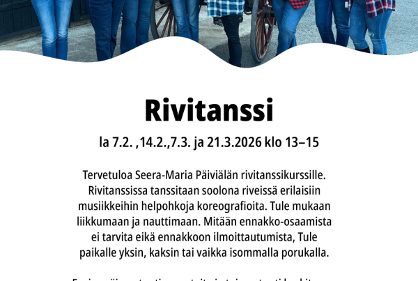 la 14.2.2026 klo 13-15 Tervetuloa Seera-Maria Päiviälän rivitanssikurssille. Rivitanssissa tanssitaan soolona riveissä erilaisiin musiikkeihin helpohkoja…