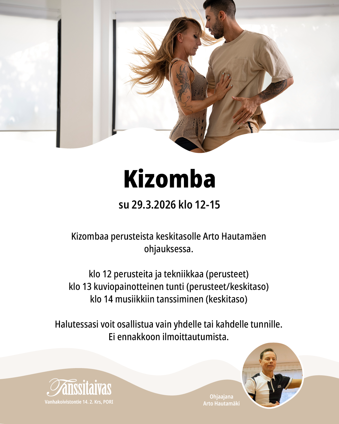 Kizombaa perusteista keskitasolle Arto Hautamäen ohjauksessa.