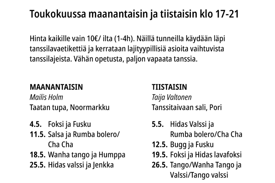 Hinnat: Tanssitaivaan ja Susel-seurojen jäsenille 20€/2t, 30€/4t, Milonga 5€.