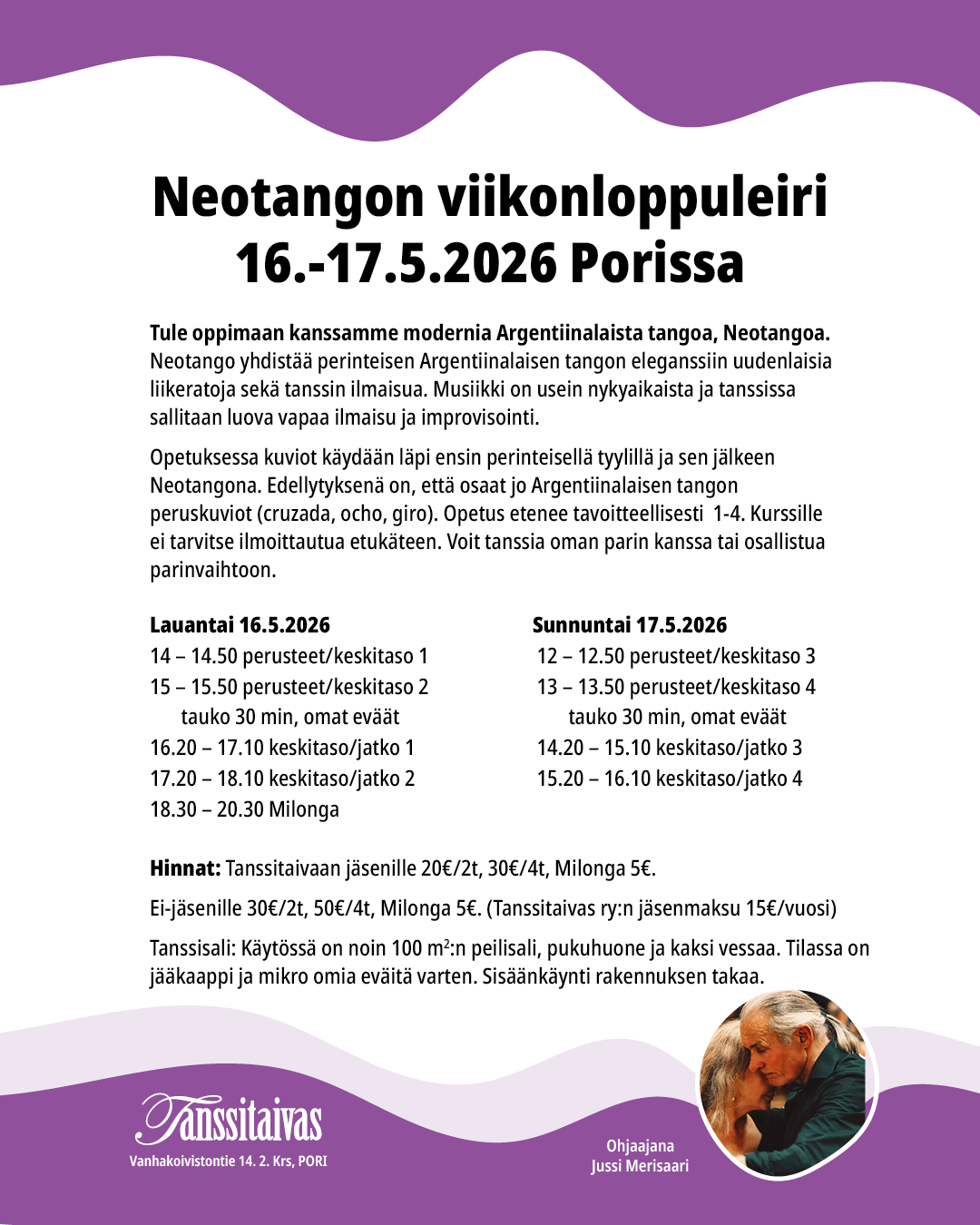 Tule oppimaan kanssamme Neotangoa, joka on moderni tyyli Argentiinalaisesta tangosta. Neotango yhdistää perinteisen Argentiinalaisen tangon eleganssiin uudenlaisia liikeratoja sekä tanssin ilmaisua. Musiikki on usein nykyaikaista ja tanssissa sallitaan luova vapaa ilmaisu ja improvisointi, eikä noudateta tiukkaa ”tanda”-rakennetta.