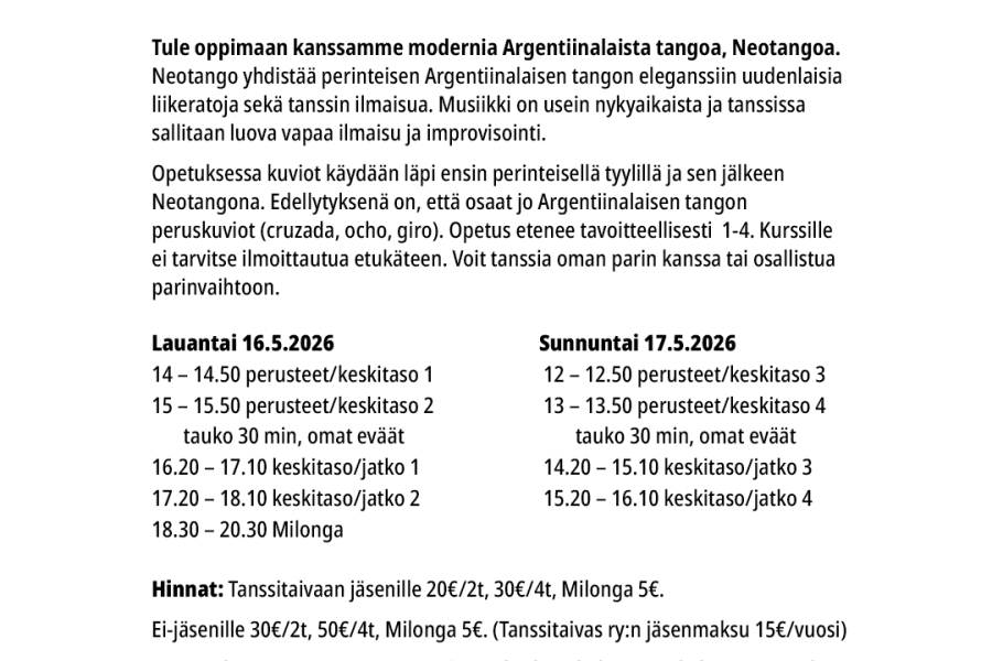 Mitään ennakko-osaamista, ilmoittautumista tai omaa paria ei tarvita. Riittää, kun saavut paikalle.