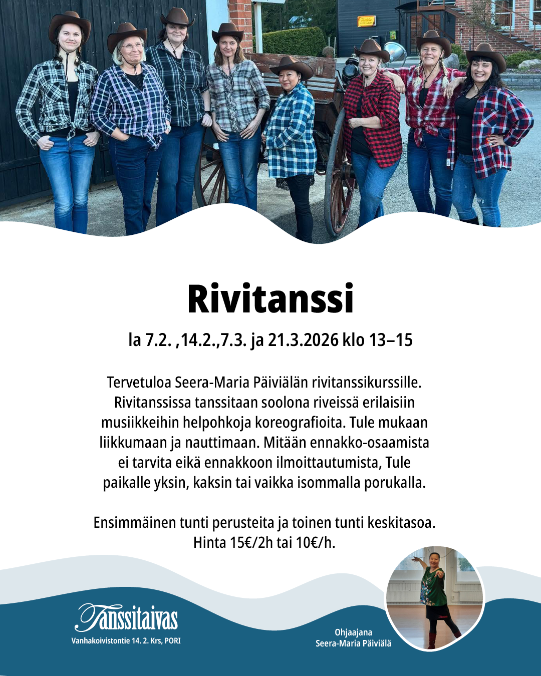 Tervetuloa Seera-Maria Päiviälän rivitanssikurssille. Rivitanssissa tanssitaan soolona riveissä erilaisiin musiikkeihin helpohkoja koreografioita. Tule mukaan liikkumaan ja nauttimaan. Mitään ennakko-osaamista ei tarvita eikä ennakkoon ilmoittautumista, Tule paikalle yksin, kaksin tai vaikka isommalla porukalla.
