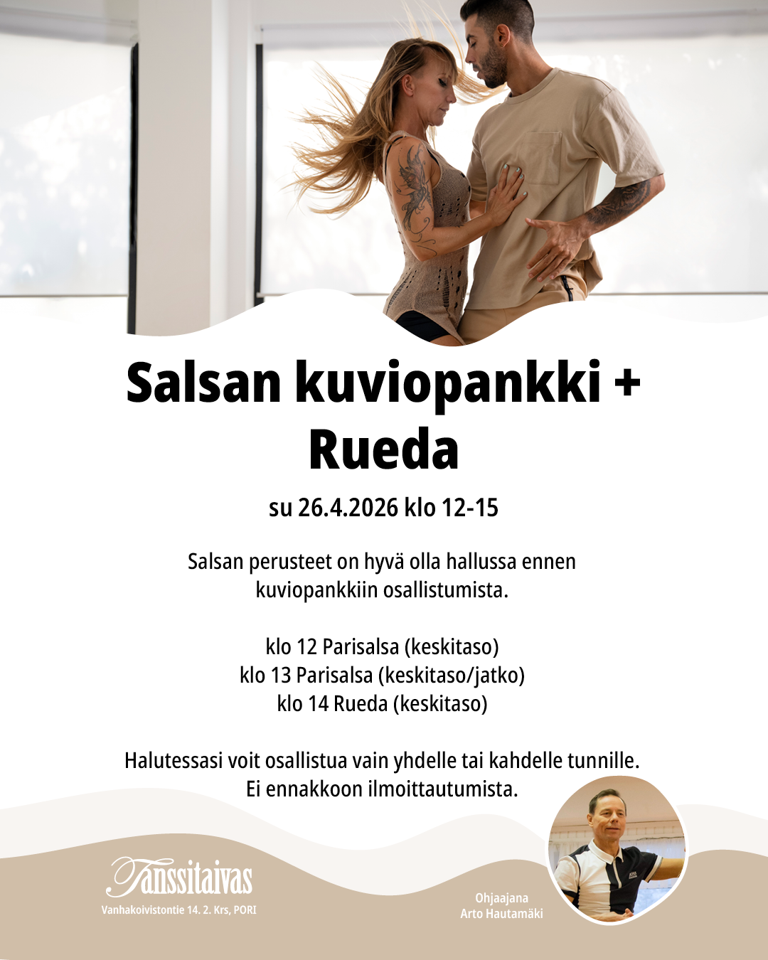 Halutessasi voit osallistua vain yhdelle tai kahdelle tunnille. Ei ennakkoon ilmoittautumista. Hintatiedot osoitteesta tanssitaivas.net/hinnasto/
