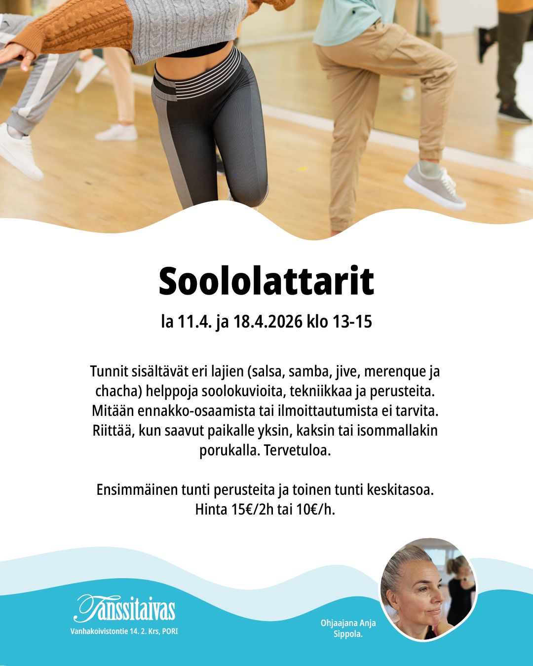 Tunnit sisältävät eri lajien (salsa, samba, jive, merenque ja chacha) helppoja soolokuvioita, tekniikkaa ja perusteita. Mitään ennakko-osaamista tai ilmoittautumista ei tarvita. Riittää, kun saavut paikalle yksin, kaksin tai isommallakin porukalla. Tervetuloa. Ohjaajana Anja Sippola.