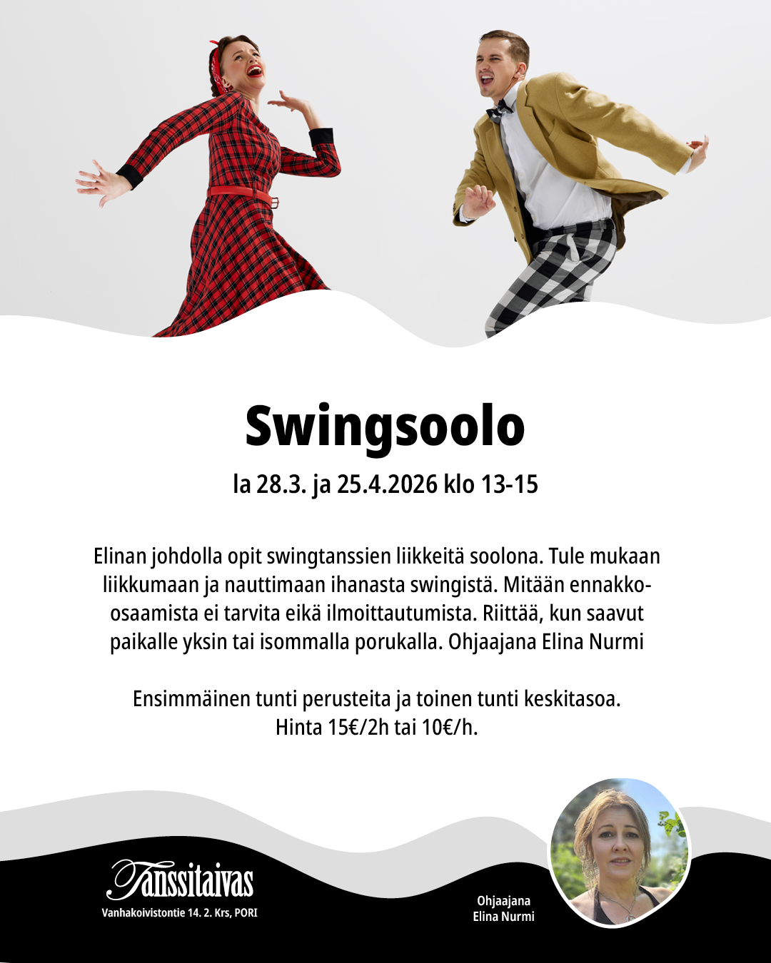 Elinan johdolla opit swingtanssien liikkeitä soolona. Tule mukaan liikkumaan ja nauttimaan ihanasta swingistä. Mitään ennakko-osaamista ei tarvita eikä ilmoittautumista. Riittää, kun saavut paikalle yksin tai isommalla porukalla. Ohjaajana Elina Nurmi.